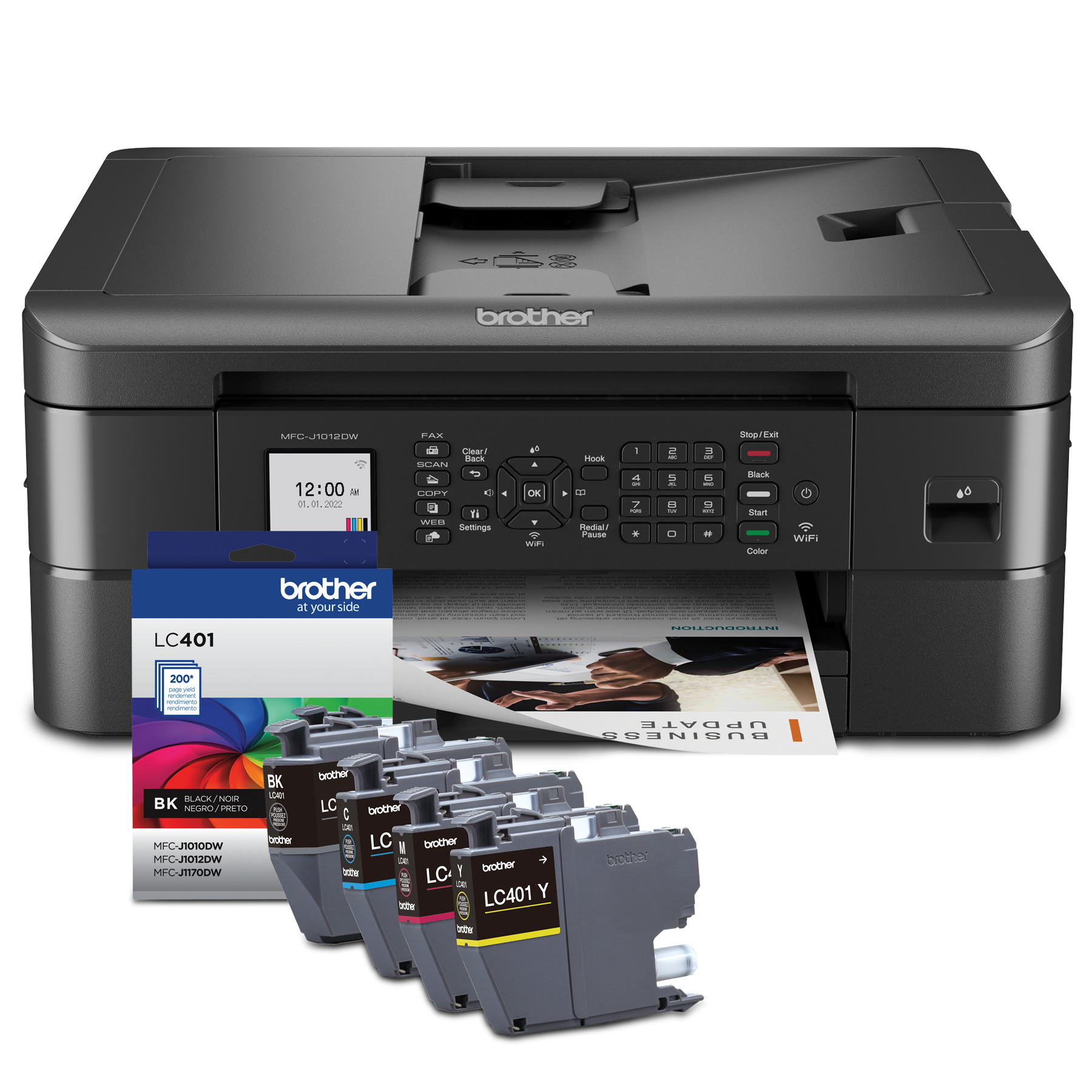 The Brother R1012LC401BUND bundle includes a refurbished RMFC-J1012DW colour inkjet all-in-one printer and LC401CMYK standard yield colour and black ink (one cartridge each of cyan, magenta, yellow [each yields up to 200 pages] and black [yields up to 500 pages]). The printer is ideal for your home, home office or small office and offers robust features and business-centric functionalities not normally found in similarly priced inkjet printers. It features print speeds up to 17 ppm for black and white and 9 ppm for colour. The RMFC-J1012DW is easy to connect and operate and because it’s compact and economical, it's perfect for small spaces and small budgets. This wireless printer has a variety of flexible connection options, including a built-in wireless interface for sharing with multiple users on your network, Wi-Fi Direct, and local connection to a single computer via a USB interface. It even works with Alexa! Enjoy the convenience of high quality, reliable printing, copying, scanning and faxing and enabling wireless printing from your desktop, laptop, smartphone or tablet. Use the 1.8” colour display to easily navigate onscreen menus or use the Brother Mobile Connect app, a user-friendly interface that gives you the freedom to print and manage your printer from virtually anywhere. The RMFC-J1012DW also features the unique Brother Page Gauge which estimates how much ink you’ve used and how much you have left, so you never run out of ink in the middle of a print job. Use the 20-page capacity automatic document feeder or the 150-sheet capacity adjustable paper tray for generous output without constant monitoring. Two-sided printing helps save paper, while mobile device printing and Cloud connectivity let you print-from and scan-to popular Cloud services directly from the device. Comes with a 1-year limited warranty and free online or live chat support for the life of the printer.