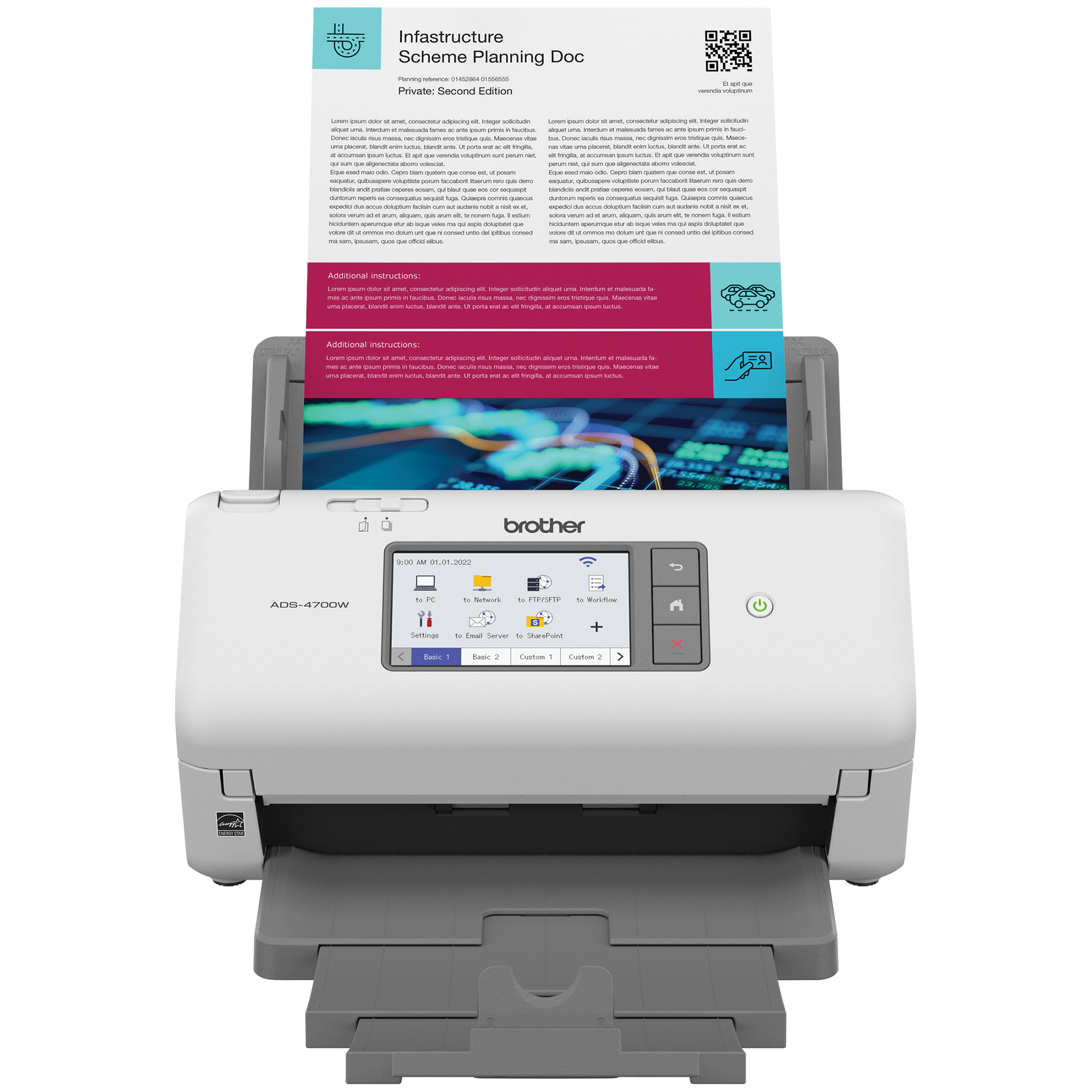 The Brother ADS-4700W Desktop Scanner delivers fast, 2-sided scanning up to 40 ppm, easily integrates with existing workflows and provides versatile scan-to destinations. Offers a 4.3" colour touchscreen display and security features to help limit document and device access. See full product description