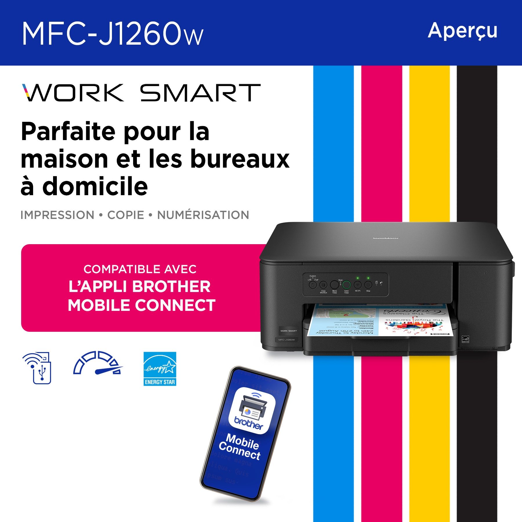 L’imprimante tout-en-un à jet d’encre couleur sans fil Work Smart MFC-J1260W de Brother offre un rendement fiable à tout coup. Elle produit des impressions de qualité aux couleurs éclatantes et aux tons de noir riches à des vitesses rapides. Jumelée à l’appli Brother Mobile Connect(2), elle permet d’imprimer partout. Pour l’impression, la copie et la numérisation, c’est un excellent investissement.