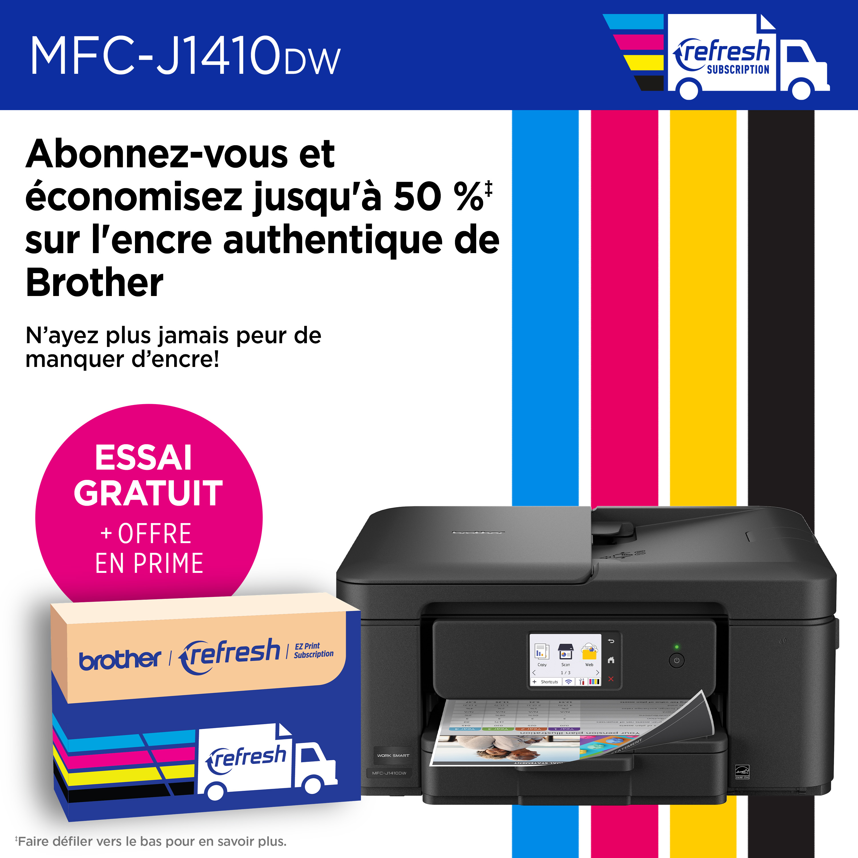 Pour en savoir plus sur le 'Brother MFC-J1410DW Imprimante tout-en-un à jet d’encre couleur sans fil Work Smart avec écran couleur de 2,7 po et impression recto verso automatique', téléchargez la brochure en cliquant ici.