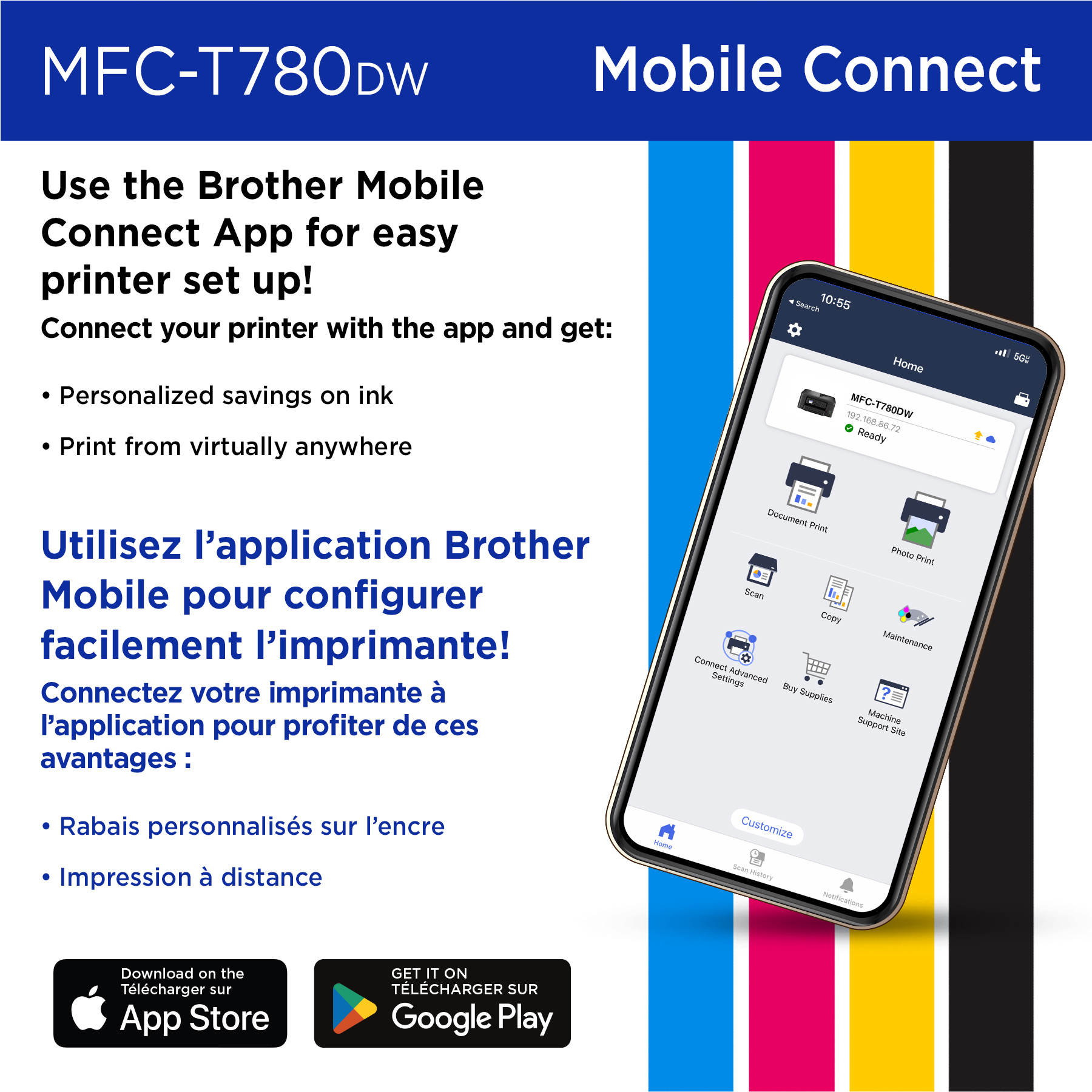 - Brother Mobile Connect. Optez pour la mobilité avec l’appli facile à utiliser Brother Mobile Connect comprenant des menus faciles à parcourir pour imprimer, copier, numériser et gérer votre appareil sur votre appareil mobile.
