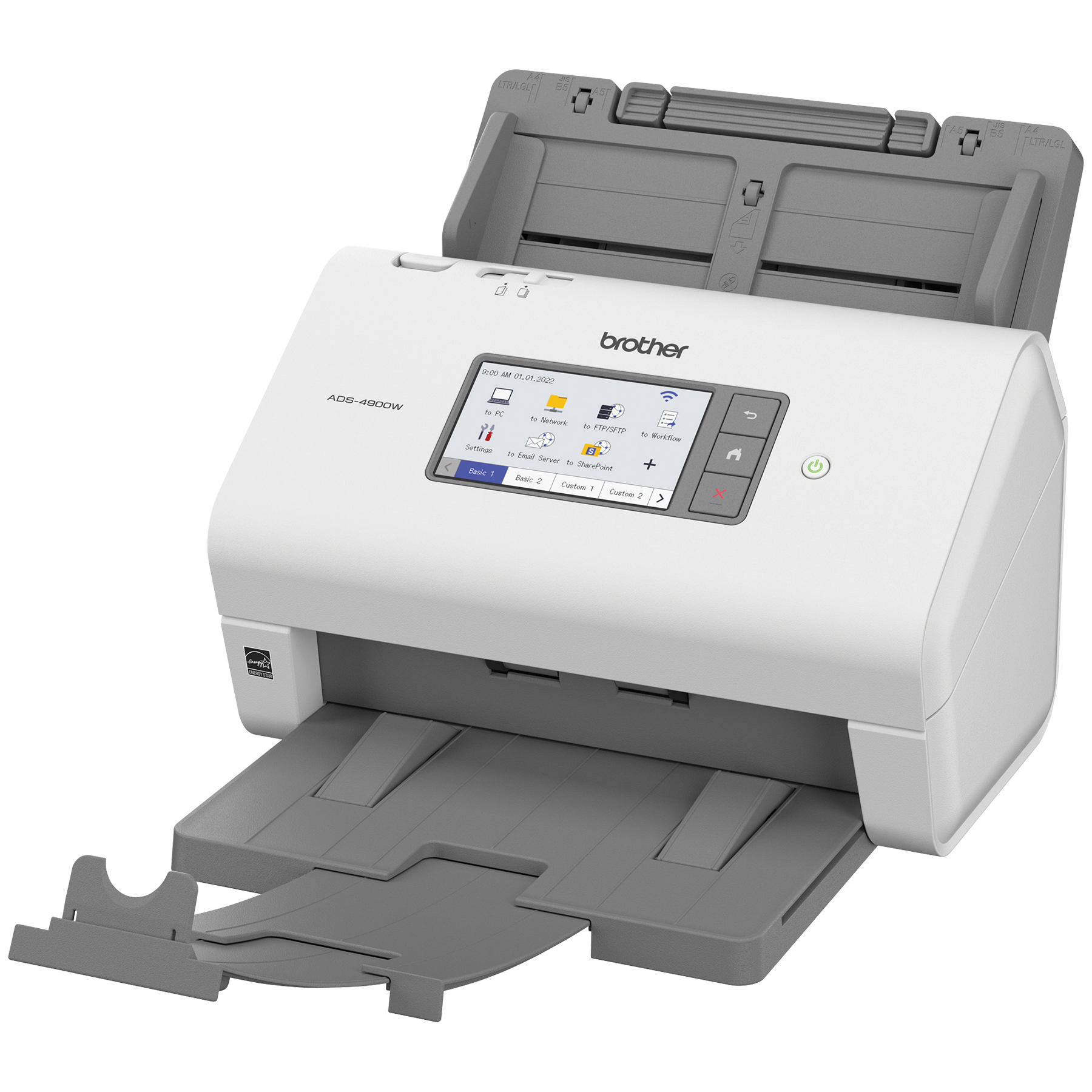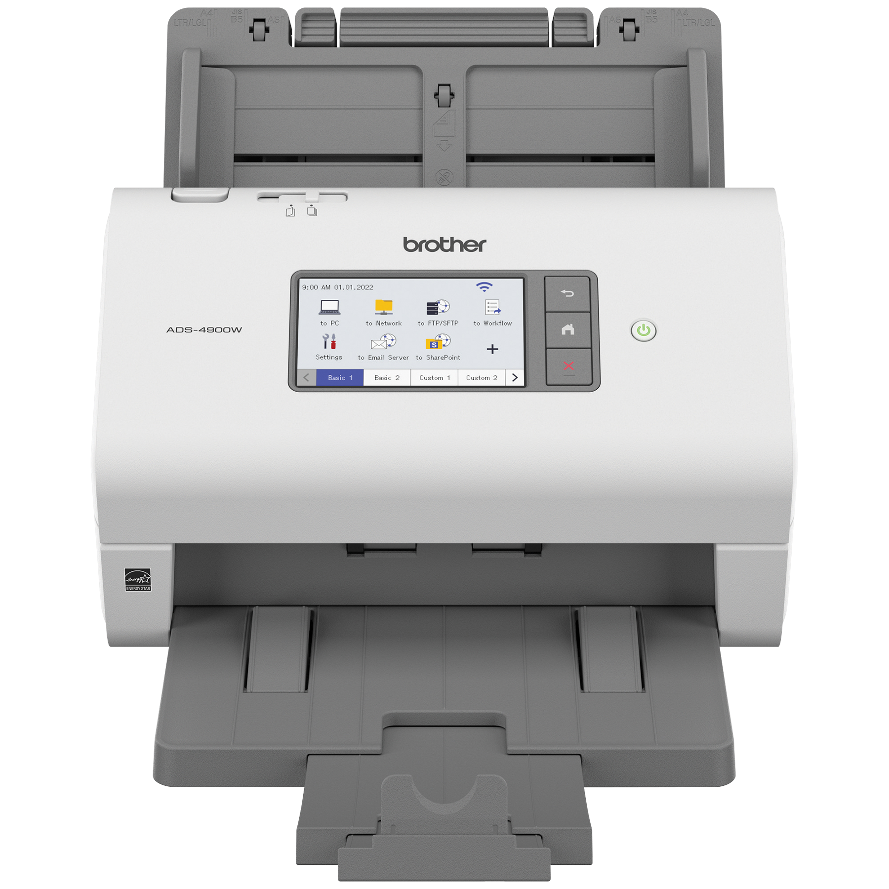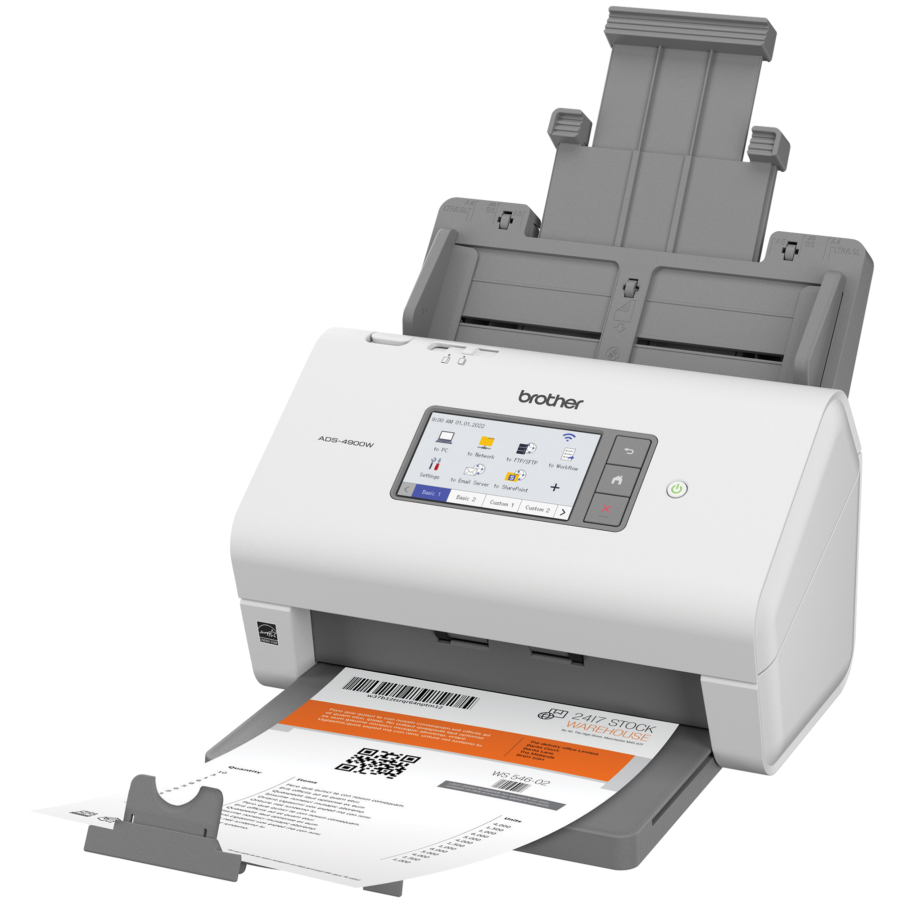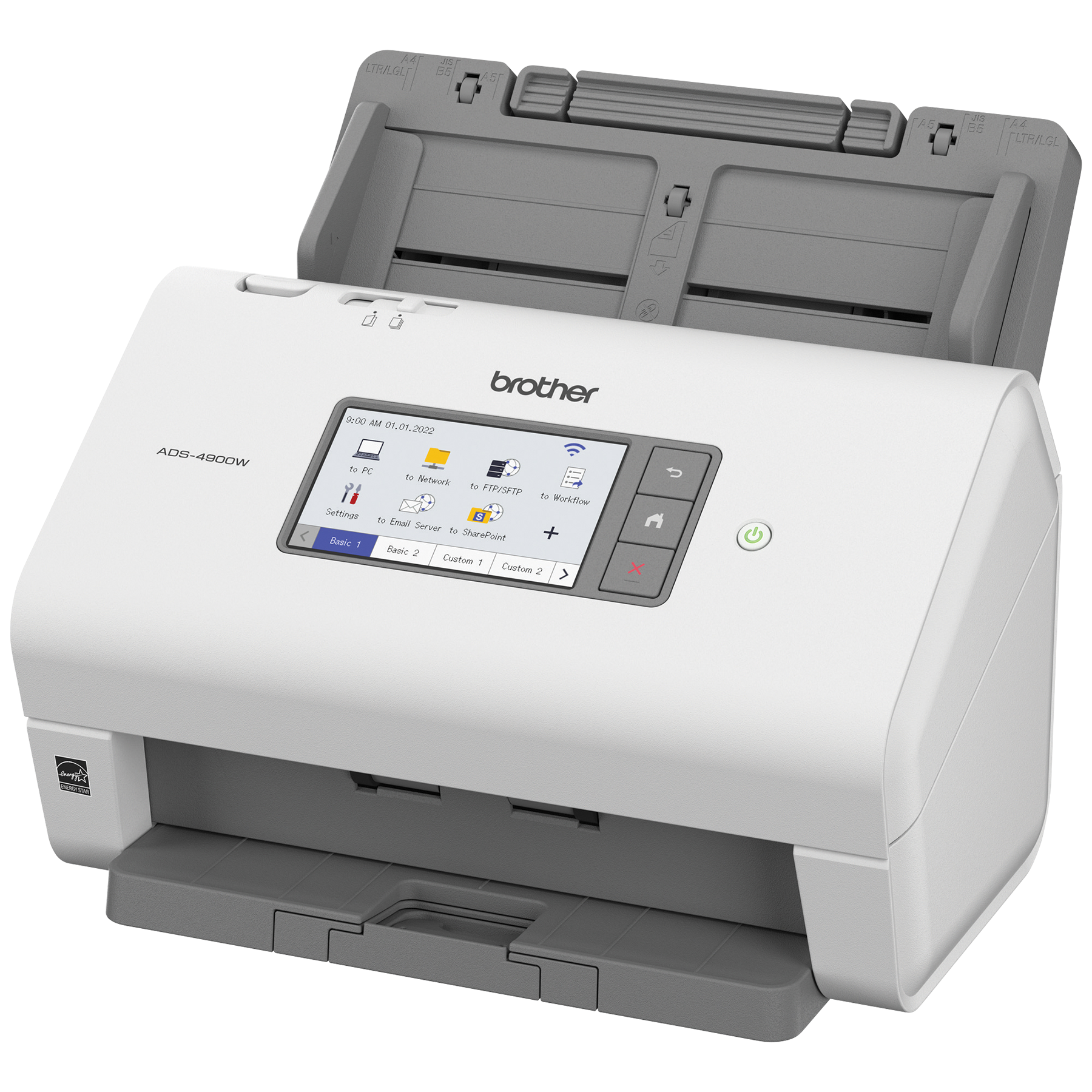 Le scanner de bureau professionnel ADS-4900W de Brother est conçu pour le monde du travail d'aujourd'hui. S’intégrant facilement à vos flux de travail, il offre des fonctions de sécurité avancées et accroit la productivité des entreprises et groupes de travail ayant des volumes de numérisation élevés. Doté d'une fonction de numérisation recto verso rapide (jusqu'à 60 ppm), il numérise rapidement des piles de papier de différents formats à partir de son chargeur automatique de documents de 100 pages. Son écran tactile couleur de 4,3 po comprend un menu facile à naviguer et permet de créer jusqu'à 56 raccourcis personnalisés pour numériser en une seule étape vers des destinations multiples et prévisualiser les documents. Ses fonctions de sécurité à trois couches limitent l'accès à l'appareil et aux documents et protègent l'appareil contre toute intrusion. Prenant en charge de nombreux pilotes (TWAIN, WIA, ISIS et SANE), il est compatible avec plusieurs applications et systèmes existants et il permet de numériser vers une variété d'applications en nuage (Google Drive™, Dropbox, OneDrive, courriels, SharePoint, serveurs SSH [SFTP], clés USB, etc.). Sa puissante suite logicielle permet de créer et de modifier des documents numérisés et de les convertir en différents formats (fichiers PDF interrogeables, fichiers PDF protégés, Word, Excel et PowerPoint). Ses fonctionnalités d'optimisation de l'image, comme le réalignement automatique, la rotation automatique des images et la suppression des bavures, produisent des résultats de qualité. Doté d'interfaces réseau sans fil bibande (2,4 GHz/5 GHz) et Ethernet, il est facile à configurer et à partager sur votre réseau et permet de numériser vers votre appareil mobile à l'aide d'AirPrint et de Brother Mobile Connect. L'ADS-4900W est homologué ENERGY STAR et EPEAT argent, et est assorti d'une garantie limitée d'un an et du soutien technique en ligne ou par clavardage en direct gratuit pour toute sa durée de vie.