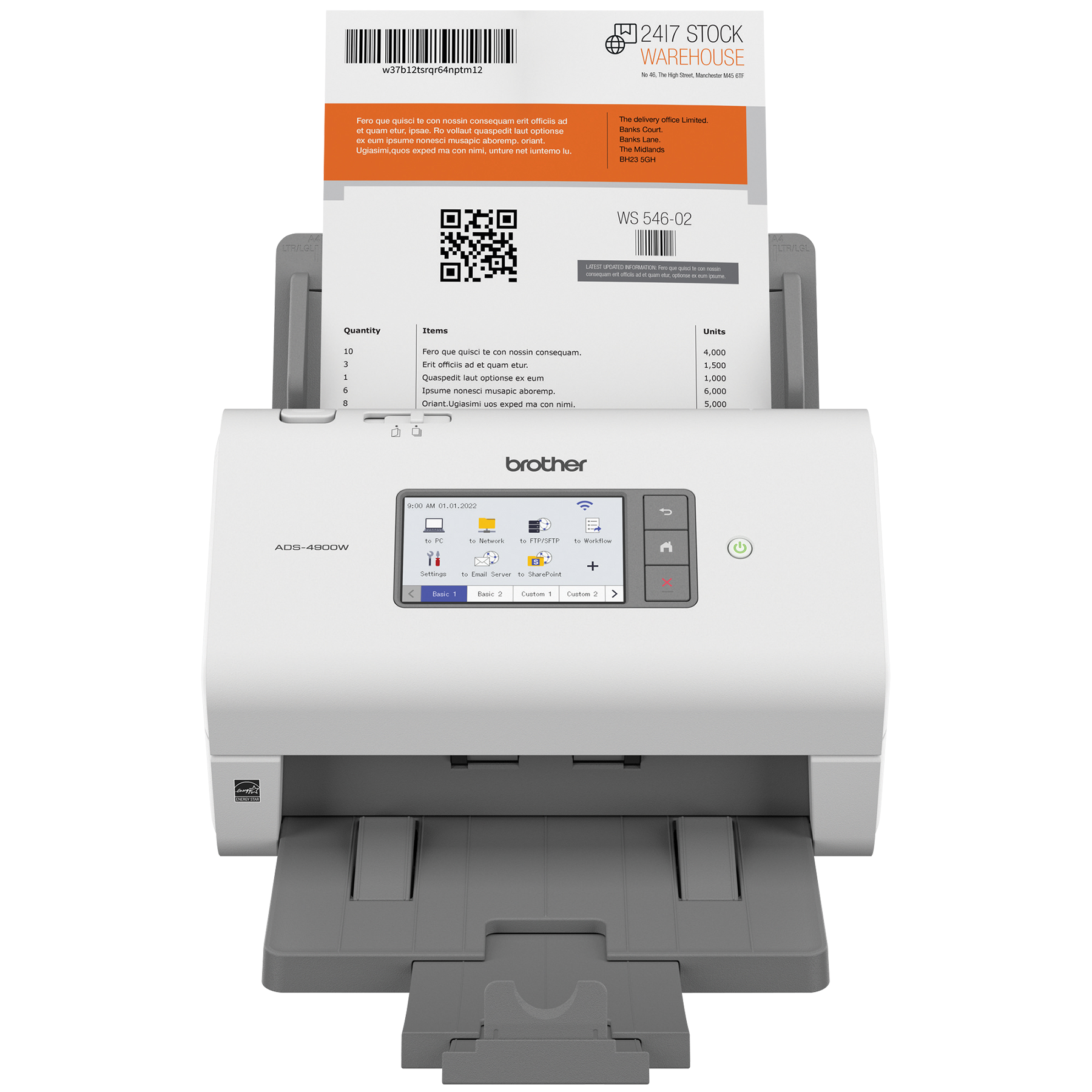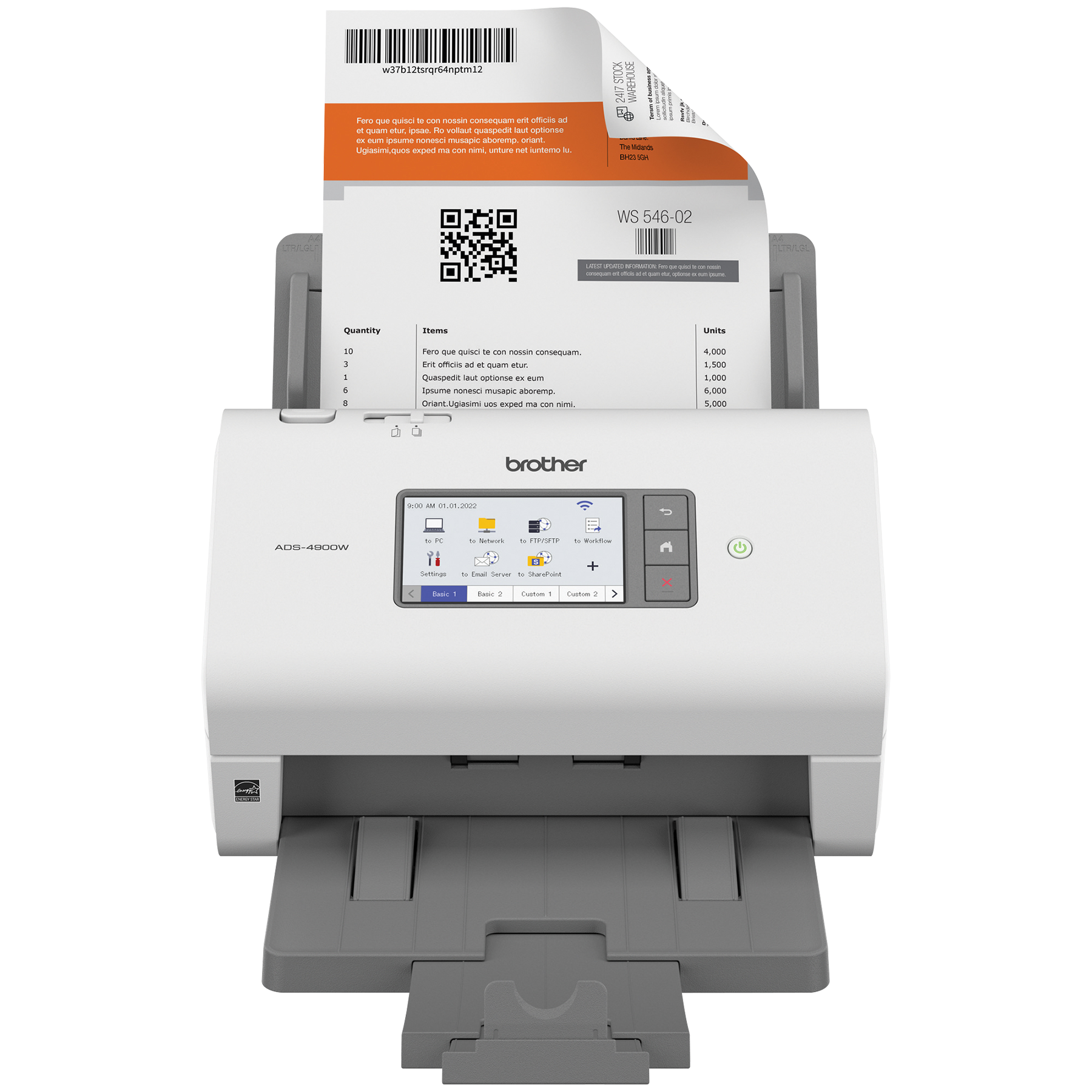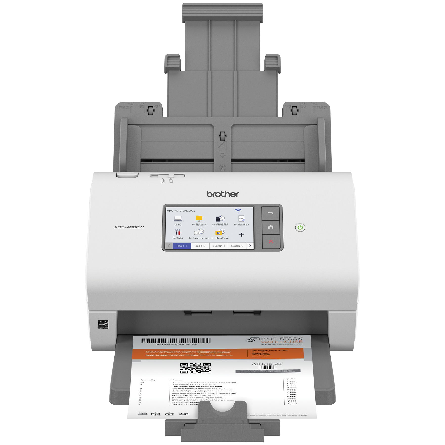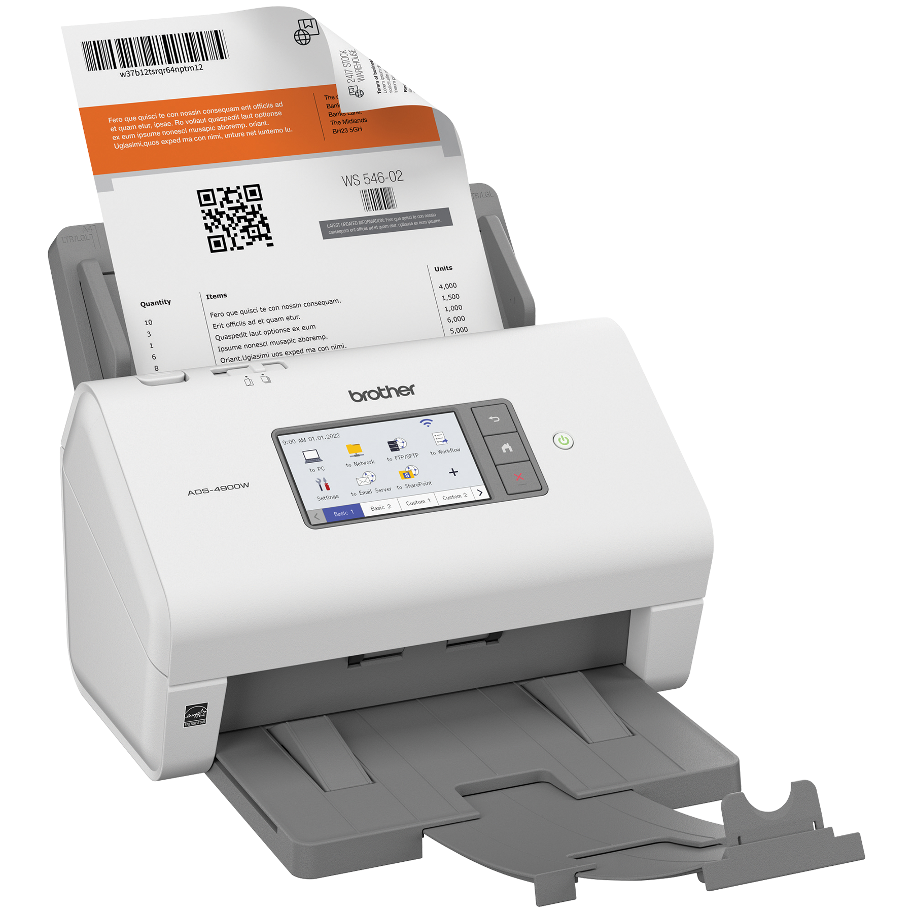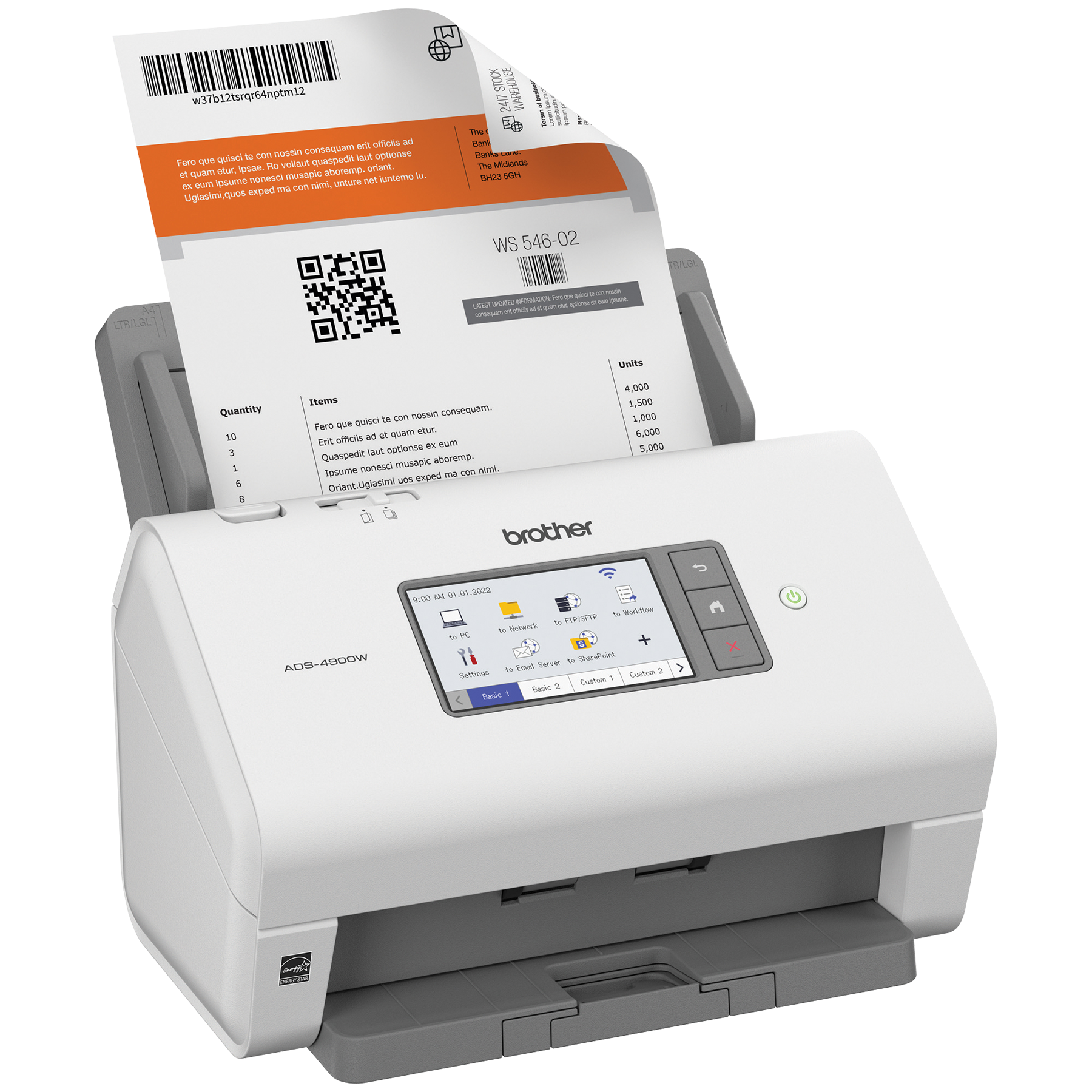 Le scanner de bureau professionnel ADS-4900W de Brother est conçu pour le monde du travail d'aujourd'hui. S’intégrant facilement à vos flux de travail, il offre des fonctions de sécurité avancées et accroit la productivité des entreprises et groupes de travail ayant des volumes de numérisation élevés. Doté d'une fonction de numérisation recto verso rapide (jusqu'à 60 ppm), il numérise rapidement des piles de papier de différents formats à partir de son chargeur automatique de documents de 100 pages. Son écran tactile couleur de 4,3 po comprend un menu facile à naviguer et permet de créer jusqu'à 56 raccourcis personnalisés pour numériser en une seule étape vers des destinations multiples et prévisualiser les documents. Ses fonctions de sécurité à trois couches limitent l'accès à l'appareil et aux documents et protègent l'appareil contre toute intrusion. Prenant en charge de nombreux pilotes (TWAIN, WIA, ISIS et SANE), il est compatible avec plusieurs applications et systèmes existants et il permet de numériser vers une variété d'applications en nuage (Google Drive™, Dropbox, OneDrive, courriels, SharePoint, serveurs SSH [SFTP], clés USB, etc.). Sa puissante suite logicielle permet de créer et de modifier des documents numérisés et de les convertir en différents formats (fichiers PDF interrogeables, fichiers PDF protégés, Word, Excel et PowerPoint). Ses fonctionnalités d'optimisation de l'image, comme le réalignement automatique, la rotation automatique des images et la suppression des bavures, produisent des résultats de qualité. Doté d'interfaces réseau sans fil bibande (2,4 GHz/5 GHz) et Ethernet, il est facile à configurer et à partager sur votre réseau et permet de numériser vers votre appareil mobile à l'aide d'AirPrint et de Brother Mobile Connect. L'ADS-4900W est homologué ENERGY STAR et EPEAT argent, et est assorti d'une garantie limitée d'un an et du soutien technique en ligne ou par clavardage en direct gratuit pour toute sa durée de vie.