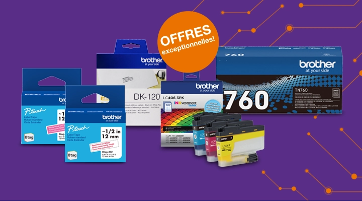 *Économisez 25 % à l'achat de 50 $ ou plus de fournitures authentiques Brother admissibles (encre, toner, étiquettes ou rubans) sur Brother.ca, jusqu'au 4 décembre 2025, à 23 h 59 (HE). Pour profiter de cette offre, connectez-vous à votre compte Brother, ajoutez dans votre panier les articles admissibles et entrez le code promotionnel CM25ACC50 au moment de passer à la caisse. Le code promotionnel est à usage unique et s'applique à un maximum de quatre (4) articles admissibles. Il ne peut être jumelé à aucune autre promotion ou réduction ni à aucun autre code promotionnel. Le montant minimum de 50 $ est calculé avant les remises, les taxes et les frais d'expédition. La remise est appliquée sur le montant de la commande avant les taxes et les frais d'expédition. Cette offre exclut les articles TN810, TN810XL, TN880, TN229XXL, TN920UXXL et les ensembles multiples de cartouches de toner. Cette offre est non transférable et ne peut être reproduite, dupliquée, copiée ou vendue. Cette offre n'a aucune valeur monétaire et ne peut être échangée contre des cartes-cadeaux ni appliquée sur des articles déjà achetés. Cette offre n'est pas valide au Nunavut, dans les Territoires du Nord-Ouest et au Yukon. Brother se réserve le droit de modifier ou d'annuler cette offre ou d'y mettre fin à tout moment sans préavis. Cette offre est sans effet là où la loi l'interdit.